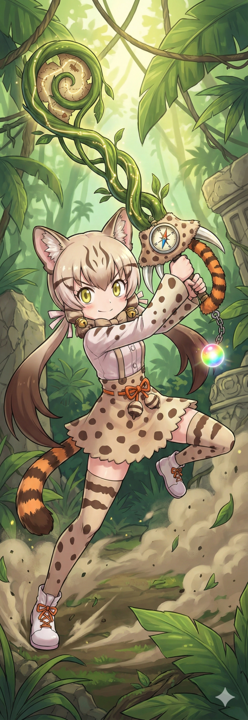 出身与经历: 在广阔的"加帕里公园"中,由"砂之星"的力量而诞生的"动物女孩",通称"动物朋友"。乔氏猫从诞生之初,就对周围的一切抱有强烈的好奇心。她憧憬着那些成熟、可靠的大人朋友们,并模仿着她们的言行,创立了属于自己的"探险队"(名为"大人同盟探险队")。她曾带领着伙伴(如竖琴海豹)进行探险游戏,甚至为了寻找误入的朋友而勇敢地踏入过禁止区域。这份经历让她获得了宝贵的实战经验,也让她"想要成为可靠队长"的信念更加坚定。
