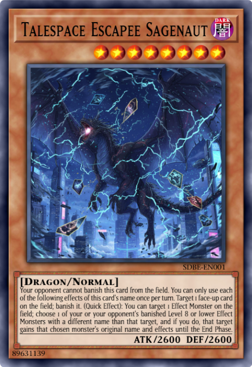 ①:从额外卡组特殊召唤的怪兽在双方场上存在的场合,从手卡丢弃1张其他卡才能发动。这张卡从手卡特殊召唤。那之后,自己从卡组抽1张。自己场上没有卡存在的场合,这个效果在对方回合也能发动。