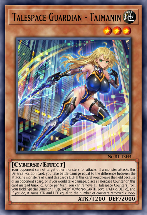 Your opponent cannot target other monsters for attacks. If a monster attacks this Defense Position card, inflict battle damage to your opponent equal to the difference between the attacking monster's ATK and this card's DEF. If this card would leave the field because of an opponent's card, or if you would take damage, place 1 Talespace Counter on this card instead (max. 9). Once per turn: You can remove all Talespace Counters from your field; Special Summon 1 "Egg Token" (Cyberse/EARTH/Level 1/ATK 0/DEF 0), and if you do, it gains ATK and DEF equal to the number of counters removed x 1000.