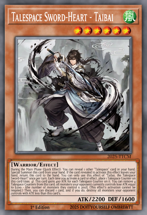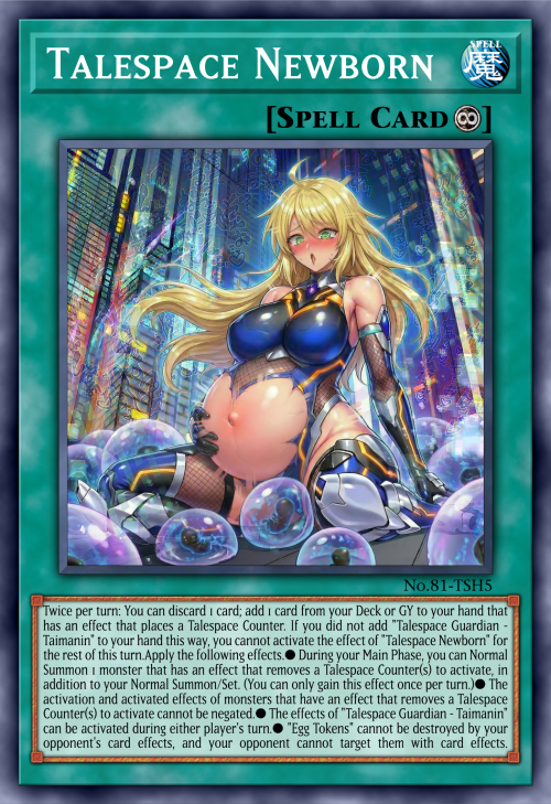 Twice per turn: You can discard 1 card; add 1 card from your Deck or GY to your hand that has an effect that places a Talespace Counter. If you did not add "Talespace Guardian - Taimanin" to your hand this way, you cannot activate the effect of "Talespace Newborn" for the rest of this turn.