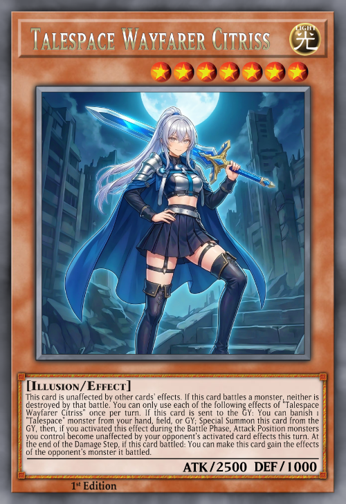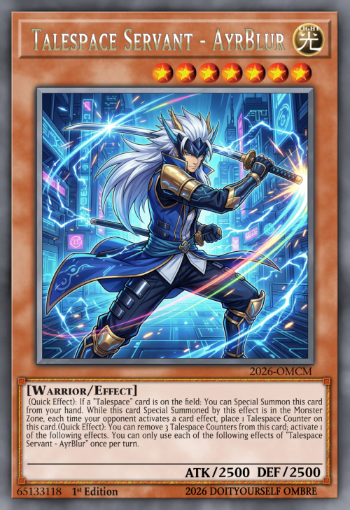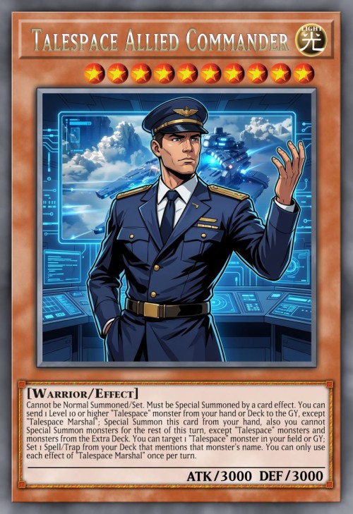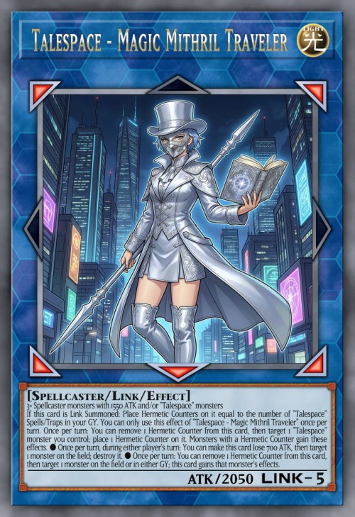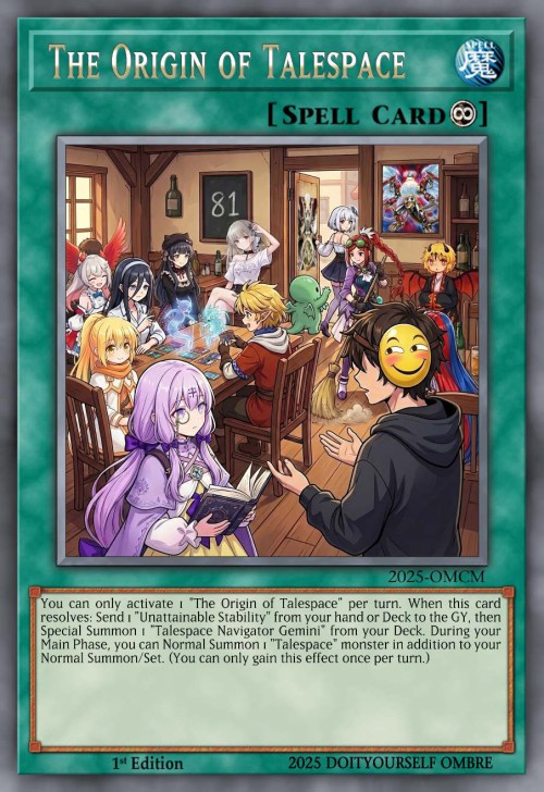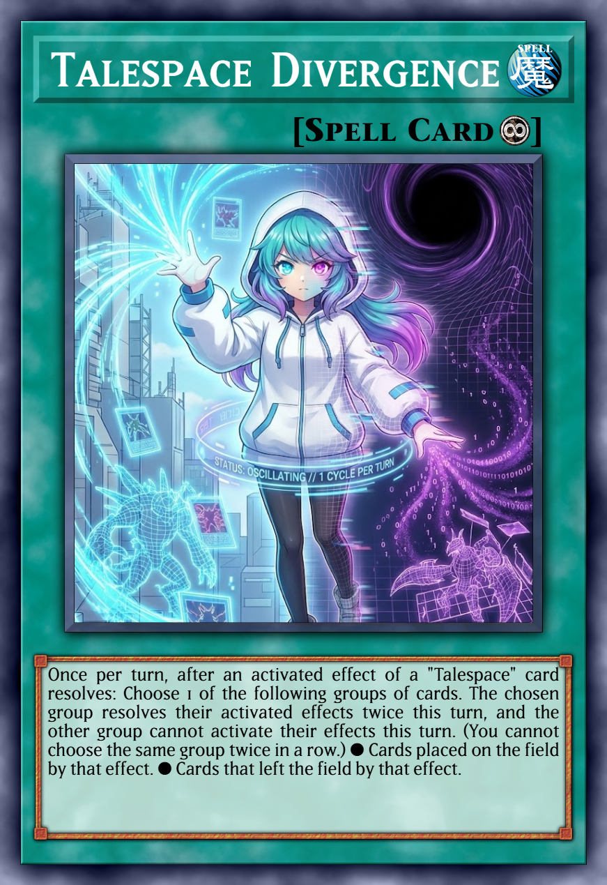 After an activated effect of a "Talespace" card resolves, choose 1 of the following groups of cards. The chosen group resolves their activated effects twice, and the other group cannot activate their effects this turn. (You cannot choose the same group twice in a row.) ● Cards placed on the field by that effect. ● Cards that left the field by that effect.