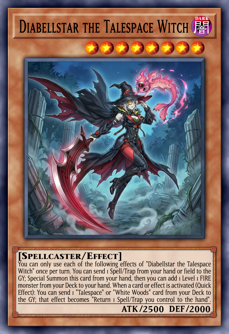 You can only use each of the following effects of "Diabellstar the Talespace Witch" once per turn. You can send 1 Spell/Trap from your hand or field to the GY; Special Summon this card from your hand, then you can add 1 Level 1 FIRE monster from your Deck to your hand. When a Spell/Trap Card's effect is activated (Quick Effect): You can send 1 "White Forest", "Sinful Spoils" or "Talespace" card from your Deck to the GY; that effect becomes "Return 1 Spell/Trap you control to the hand".